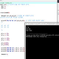 1 2 3 4 5 6 7 8 9 10 11 12 13 14 15 16 17 18 19 20 21 22 23 | 예제) #include<stdio.h> struct point{ int x; int y; }; void function(struct point* s); int main(void){ struct point p={10, 20}; // 구조체 만들어서 10, 20 넣음. function(&p); // 주소에 의한 호출 s by reference return 0; } void function(struct point* s){ printf("%d %d \n",s->x,s->y); printf("%d %d \n",(*s).x, (*s).y); // s가 가르키는 값의 x, y } | cs |