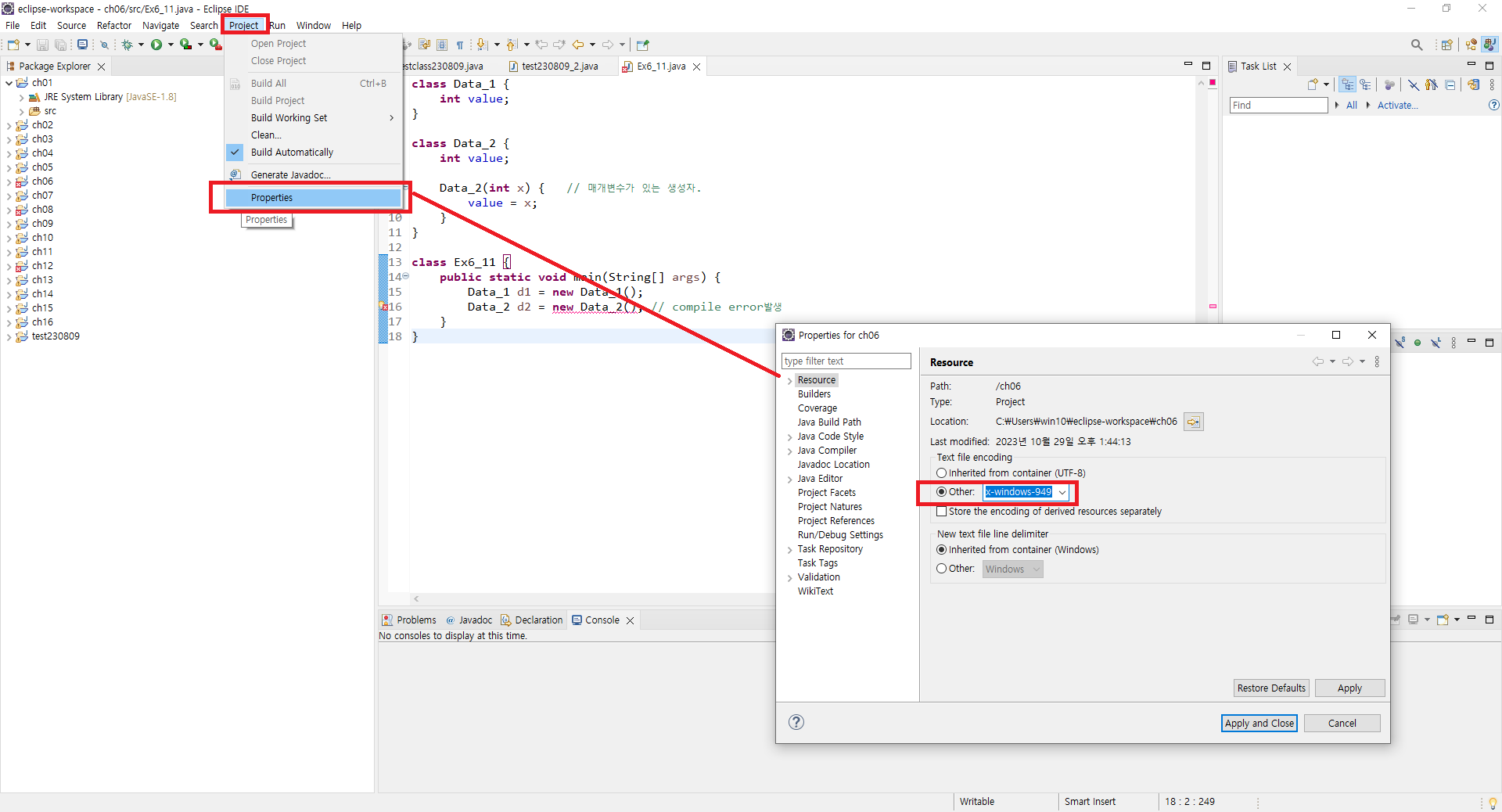 project - properties -> Resource - Text file encoding - other : 949 변경